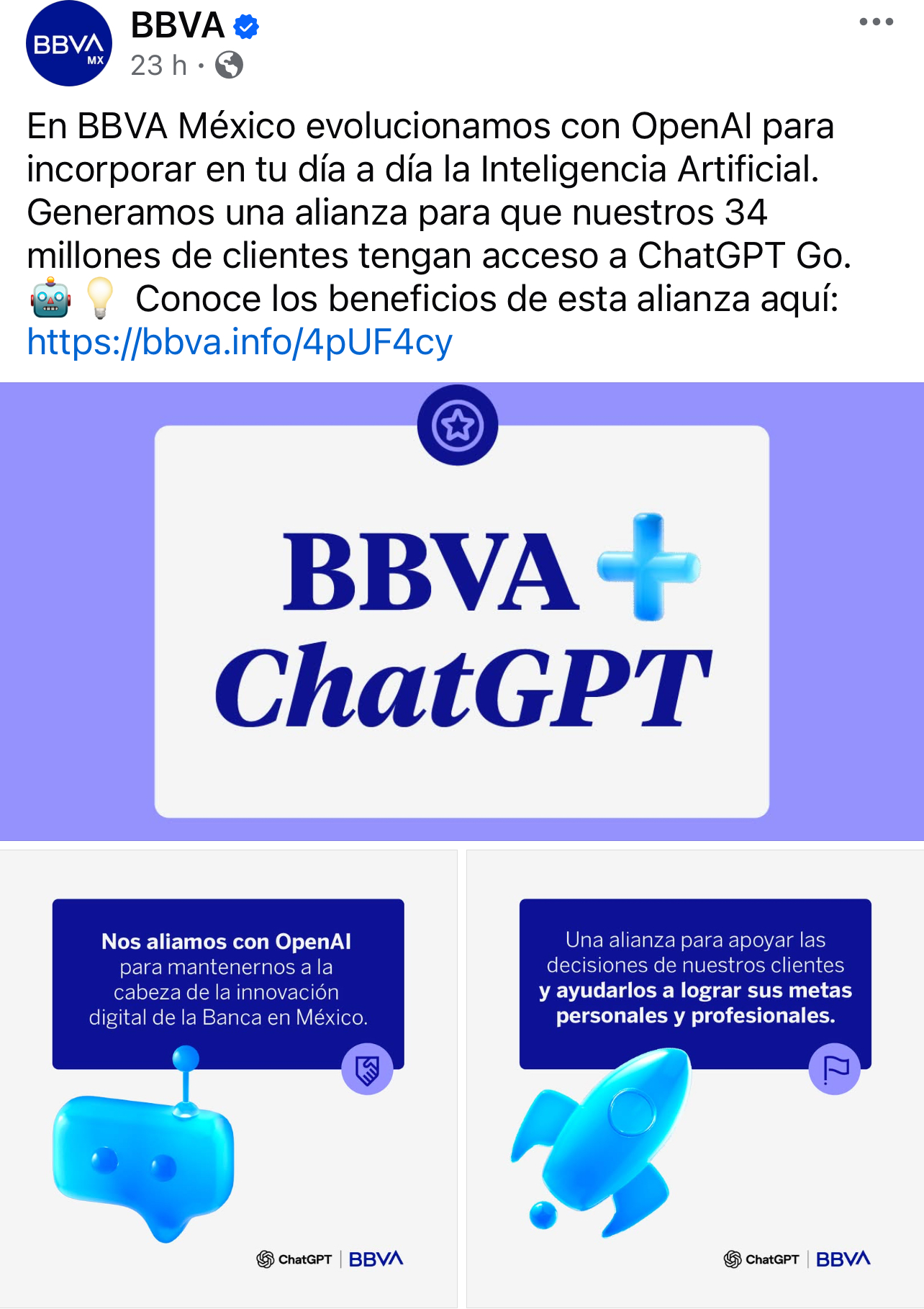 BBVA México anunció una alianza con OpenAI para ofrecer a más de 34 millones de clientes una promoción exclusiva que permitirá acceder sin costo a ChatGPT Go durante tres meses, a partir del 26 de enero. Esta iniciativa busca acercar las capacidades de la Inteligencia Artificial (IA) a la vida cotidiana de las personas, más allá del ámbito financiero.