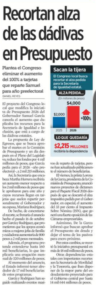 El periódico El Norte exhibió en su primera plana que el Congreso local busca frenar el disparo de las dádivas electorales que el Gobernador Samuel García pretendía repartir en pleno año preelectoral, mediante el Presupuesto 2026.