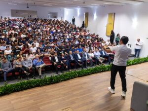 Ante cientos de jóvenes reunidos en el auditorio de la institución, el alcalde destacó que Juárez es ya el cuarto municipio más poblado del Área Metropolitana, con más de 500 mil habitantes y un territorio de 247 kilómetros cuadrados, el doble del tamaño de Guadalupe y Apodaca. Resaltó además la ubicación estratégica de Juárez y una ventaja única: la disponibilidad de agua superficial y subterránea, factor clave para la atracción de inversiones.