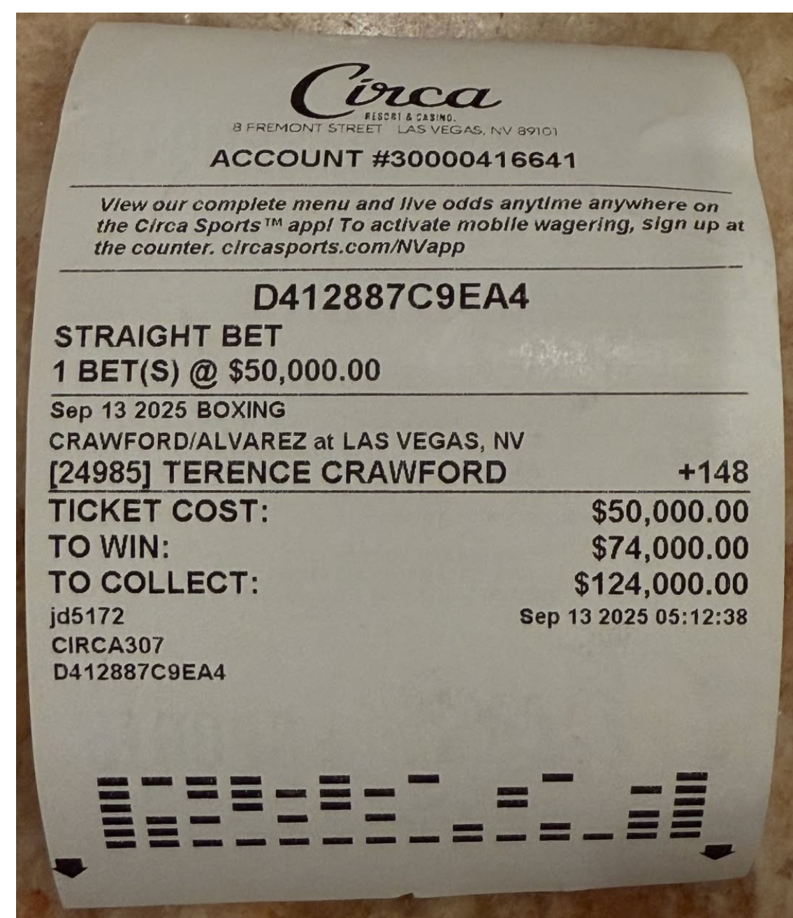 El histórico peleador estadounidense, apareció en su red social, Instagram, publicando una foto donde muestra que apostó 50 mil dólares a que el Canelo perdía y gracias a una excelsa exhibición de Crawford en Las Vegas   la apuesta del Money se hizo válida.