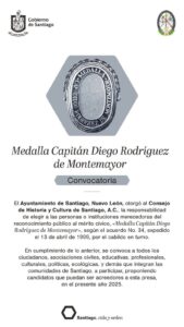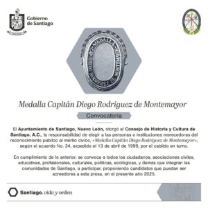 El Presidente Municipal de Santiago, David de la Peña Marroquín, invitó a toda la comunidad santiaguense para que proponga candidatos a la Medalla al Mérito Cívico “Capitán Diego Rodríguez de Montemayor”, que se entregará el próximo mes de noviembre.