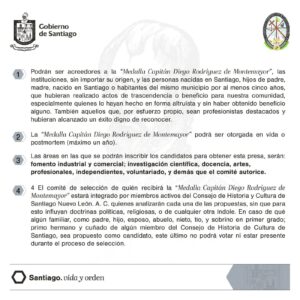La convocatoria, lanzada por el Consejo de Historia y Cultura de Santiago A.C., establece que los postulantes podrán ser inscritos hasta el próximo 15 de octubre y la medalla se otorgará el día 22 de noviembre.
