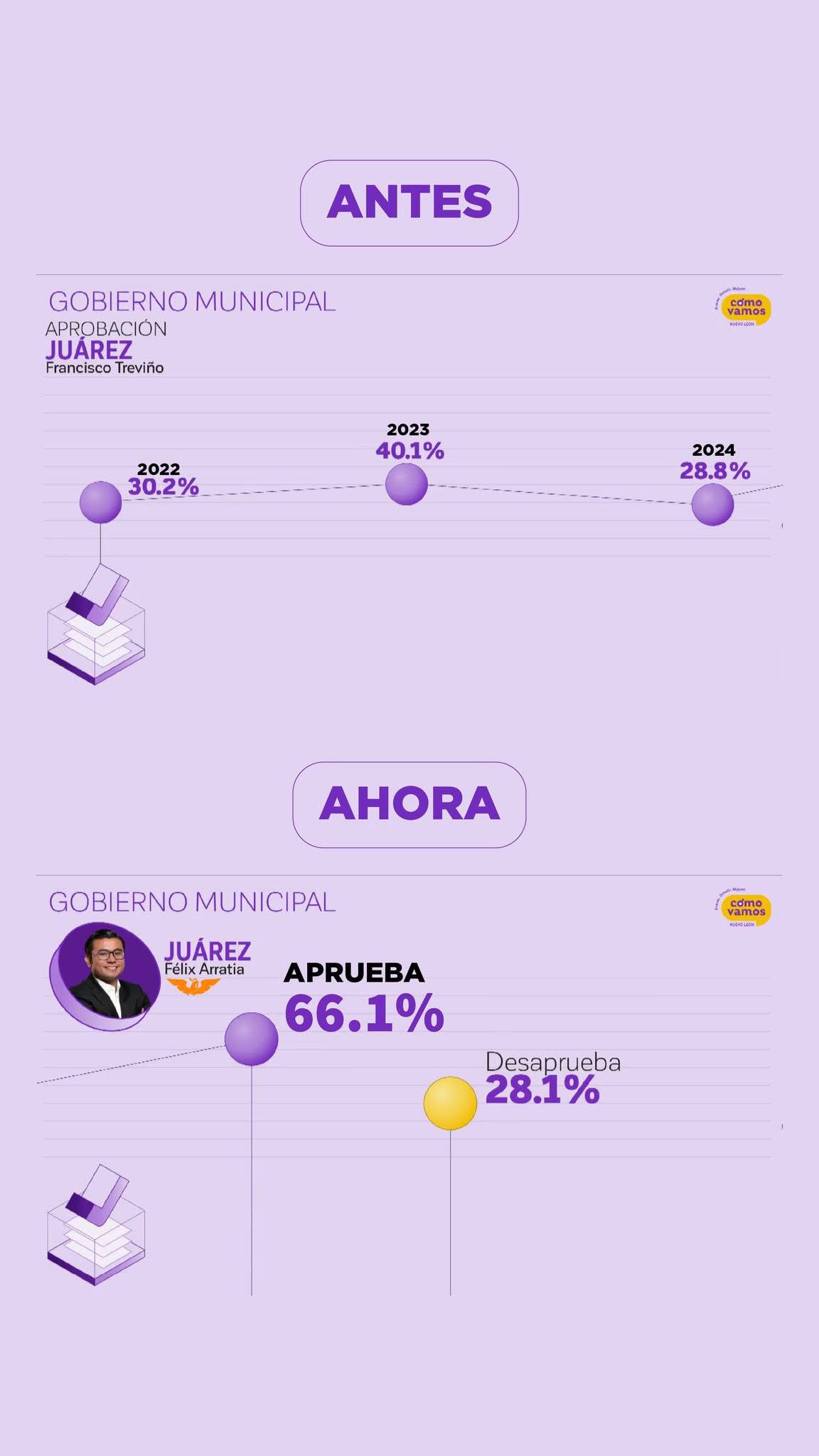 Actualmente, la administración encabezada por Félix Arratia registra 66.1% de aprobación, con 28.1% de desaprobación.