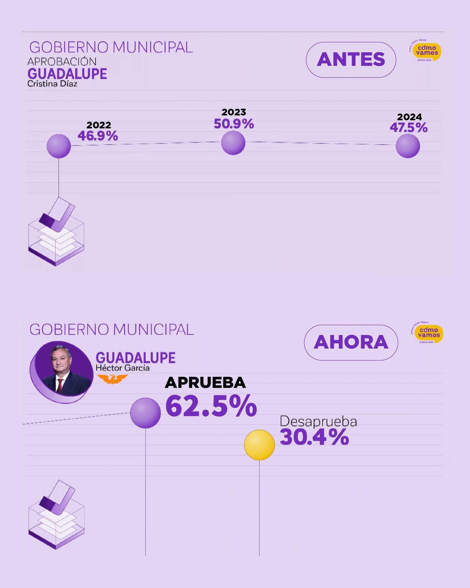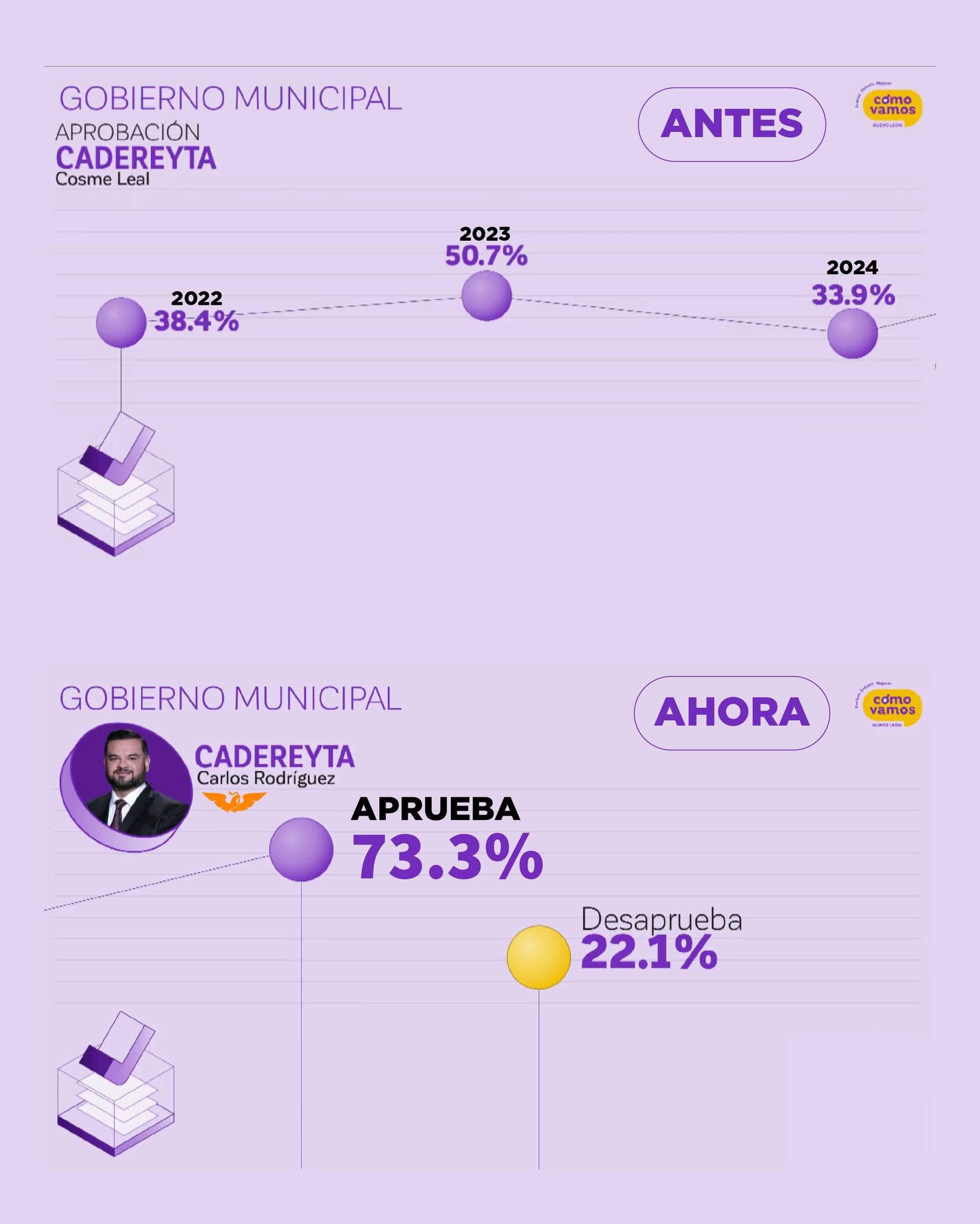 Los datos difundidos por Cómo Vamos Nuevo León muestran que Cadereyta y Juárez destacan por su incremento en aprobación, convirtiéndose en los casos más representativos del estudio 2024.