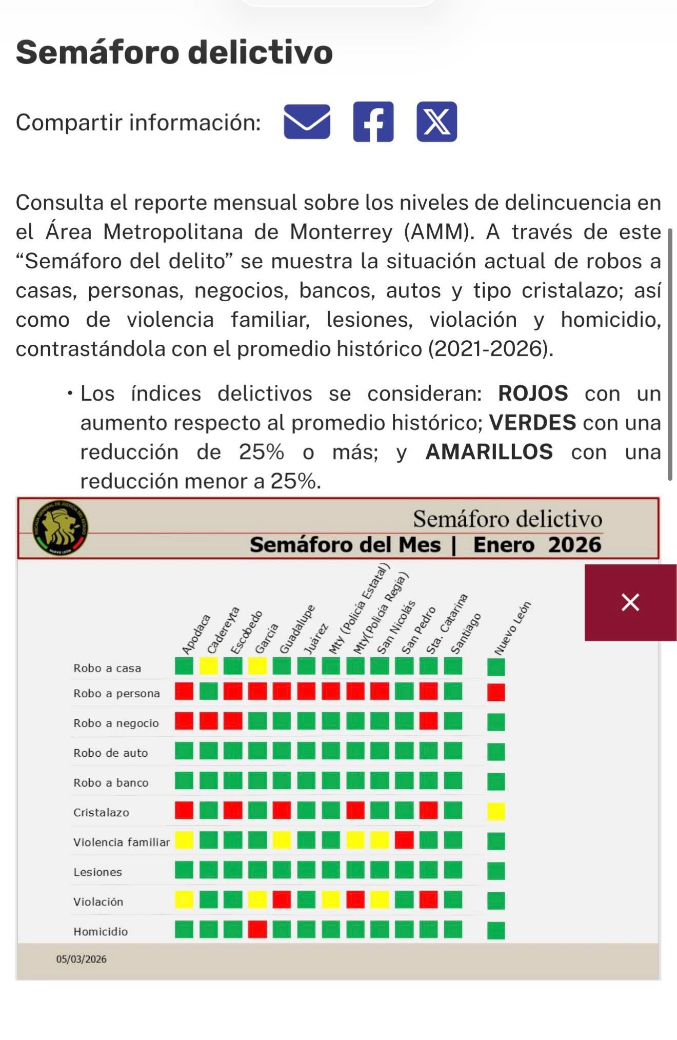 El Semáforo Delictivo analiza mensualmente distintos delitos registrados en el Área Metropolitana de Monterrey, comparando las cifras actuales con el promedio histórico entre 2021 y 2026.
