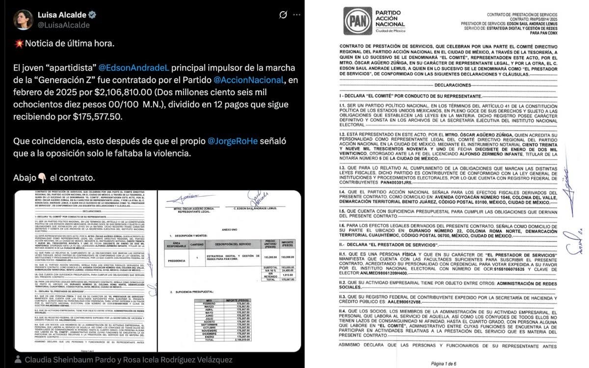 A través de sus redes sociales, la líder morenista Luisa María Alcalde Luján difundió un contrato y diversas facturas que indicarían que Andrade Lemus fue contratado por el PAN desde febrero de 2025 como prestador de servicios.