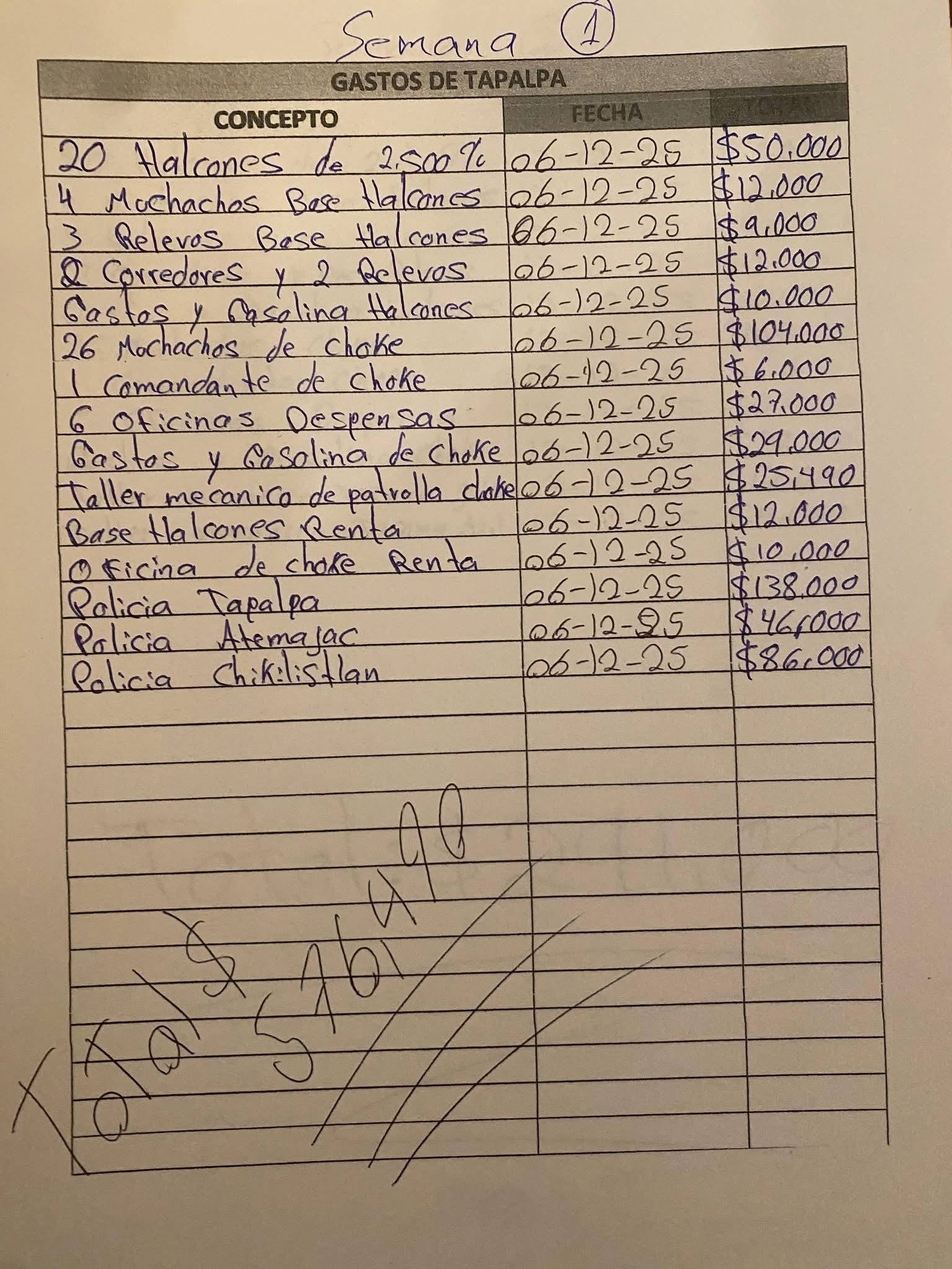 Entre los apuntes aparece una hoja fechada el 1 de diciembre de 2025 que consigna 300 mil pesos en gastos de Hugo César Macías Ureña, “El Tuli”, operador financiero del grupo, abatido en un operativo del Ejército Mexicano y la Guardia Nacional en Autlán de Navarro.