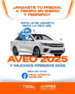Con el objetivo de incentivar el cumplimiento oportuno del pago del impuesto predial, el Gobierno Municipal de Juárez, que encabeza el alcalde Félix Arratia Cruz, realizará el Sorteo para Contribuyentes Cumplidos del Pago del Impuesto Predial 2025. Esta rifa busca reconocer el compromiso de las y los ciudadanos responsables a través de la entrega de atractivos premios, entre los que destaca un automóvil último modelo.
