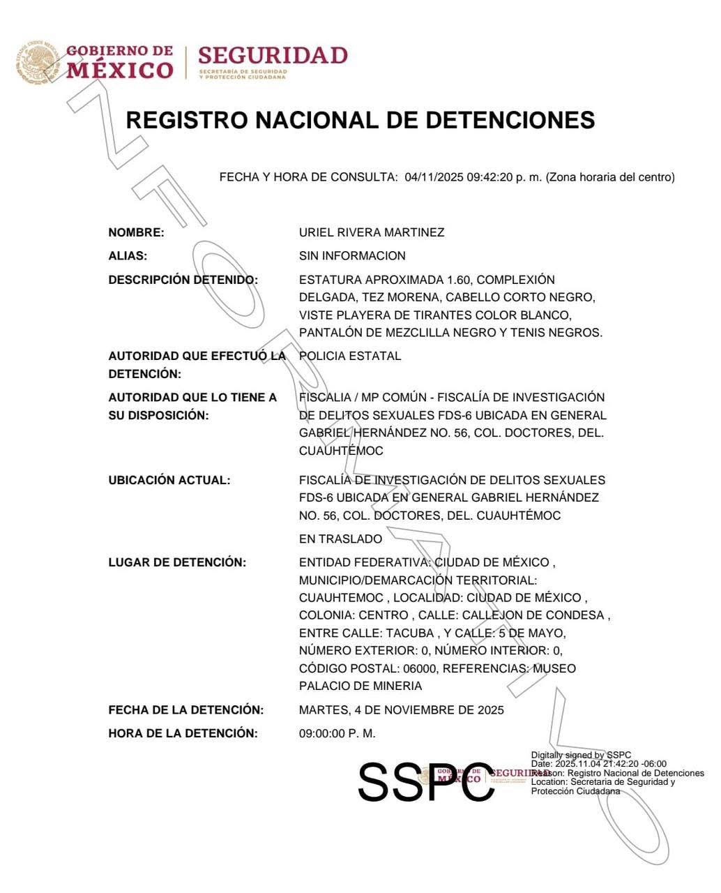 🔴Uriel Rivera ya aparece en el Registro Nacional de Detenciones, tras darse a conocer que el sujeto que intentó sobrepasarse con la presidenta Claudia Sheinbaum había sido detenido en la CDMX.