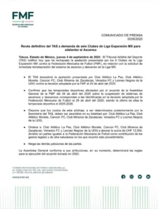 Ciudad de México.- El regreso del ascenso al futbol mexicano ya tiene fecha, pero no aún un formato. Tras el dictamen del Tribunal Arbitral del Deporte (TAS), quedó establecido que será la Asamblea General de la Federación Mexicana de Futbol (FMF) la que defina cómo volverá este sistema a partir de la temporada 2026-2027.