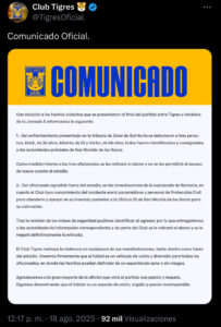 Luego de esta jornada de violencia en El Volcán, los Tigres se manifestaron en sus redes a través de un comunicado en el que aseguraron que de la pelea que se dio en la tribuna de Zona de Gol Norte “sedetuvieron a tres personas, Erick, de 24 años; Alberto, de 52 años y Víctor, de 54 años, todos fueron identificados y consignados a las autoridades policiales de San Nicolás de los Garza”.